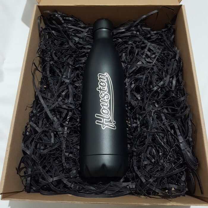 Box Botella Térmica Personalizada es una opción elegante y sustentable para regalar en acciones corporativas. Esta presentación incluye una botella de acero inoxidable tipo “urban” con aislamiento térmico, ideal para mantener bebidas frías o calientes por varias horas, y viene dentro de una caja kraft con viruta decorativa negra. El grabado láser se puede aplicar tanto en la botella como en el packaging, reforzando la identidad de marca desde el primer contacto.