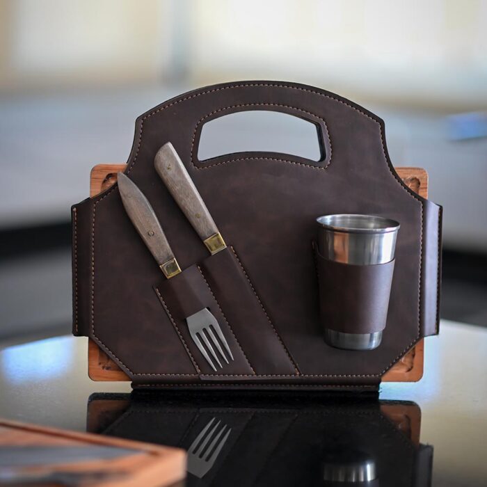 Set de asado con estuche de ecocuero, cubiertos artesanales, vaso de acero y tabla grabada. Compacto, elegante y totalmente personalizable.