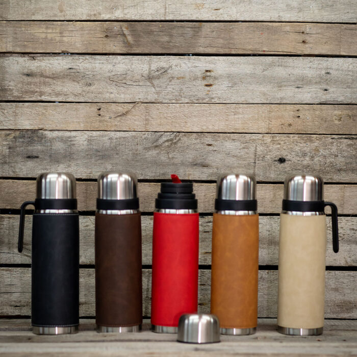 Termo de acero forrado en ecocuero con media manija. Capacidad 1L, diseño elegante y personalizable. Perfecto para regalos corporativos con estilo.